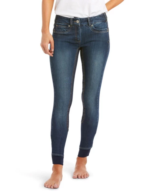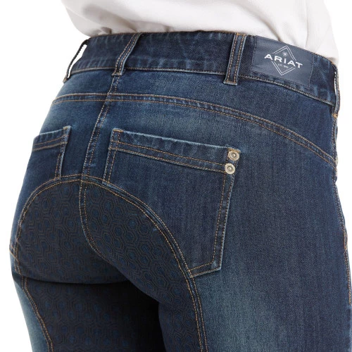 Women’s Ariat Halo Denim Full Seat Breeches are perfect for riders who love their jeans but need the comfort and performance of riding breeches. Ariat delivers! The authentic denim look has all the Ariat technology you depend on for comfort in the saddle. Ladies full seat breech has a flattering, slimming fit with Core Control Technology. The Ariat Hex Silicone Grip full seat gives you grip in the saddle with plenty of flex.