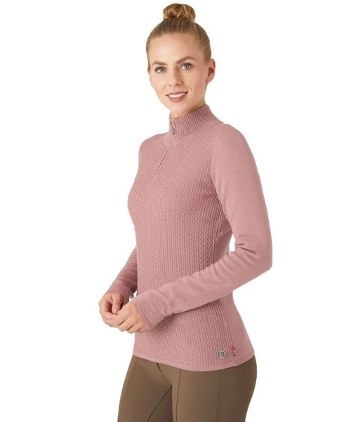 B Vertigo Ruth 1/4 Zip Sweater in cable knit and flat knit is lightweight, breathable, and comfortable for riding. The yarn blend is merino wool and acrylic so you get the performance features plus easy care. Classic neutrals Shiitake, Old Rose Pink, and Dark Blue will look good always!