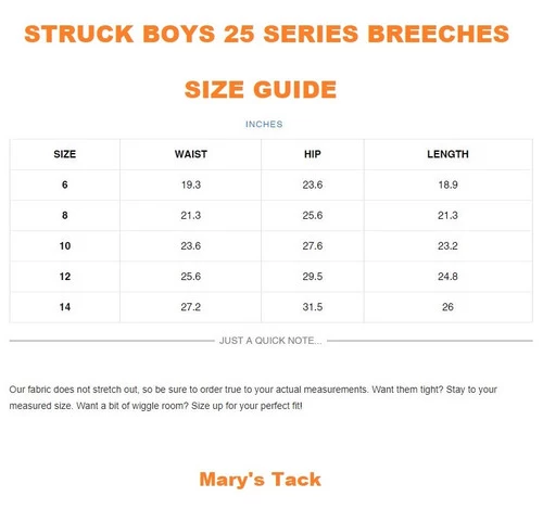 *Sizes 6 and 8 Struck breeches are a pull on style with no zipper. There is a faux fly and button.