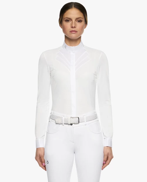 The Fan Bib Swiss Dot Competition Shirt from Cavalleria Toscana has a feminine, polished look that flatters. The elegant bib inlay in a fan design adds a beautiful luxury element. The Swiss dot silky technical fabric is stretchy, light, and cool with a slim fit. Cavalleria Toscana Fan Bib Swiss Dot Show Shirt is cutting edge, stylish women’s equestrian apparel with fit and quality that riders appreciate.