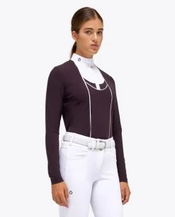 Girls Team Daytona Long Sleeve Competition Polo has a slim, stretchy fit with technical jersey that wicks, dries, quickly, and prevents odors. The high collar is a cotton blend poplin and features an embroidered CT logo. The pullover polo has a quarter zipper with CT pull. White contrast piping and Team racing graphic is sophisticated and distinctive. Girls Cavalleria Toscana Team Daytona Long Sleeve Polo is a great look for horse show competitors who love superior performance and style.