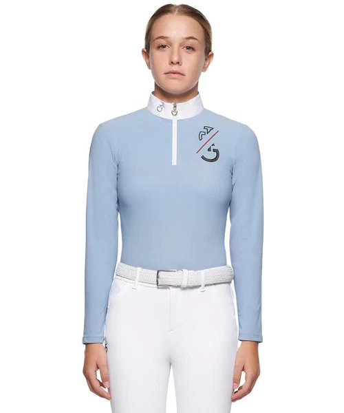 The beautiful light blue color makes the Cavalleria Toscana Girls Team Competition Zip Polo a style standout! The young rider’s long sleeve competition shirt has premium stretch tech fabric, a crisp white poplin show collar, and bold team red stripe logo accents for contemporary style.