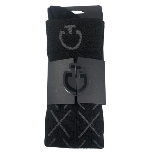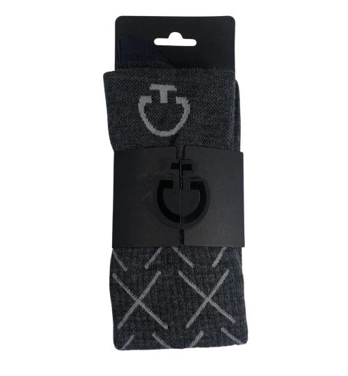 Cavalleria Toscana Wool Socks With Logo are warm yet lightweight with a technical yarn blend that wicks moisture and dries quickly. Soft and stretchy tall boot socks from Cavalleria Toscana are available in Black, Grey, and Navy with an all-over X pattern and CT logo at the cuff.