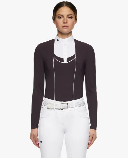 Cavalleria Toscana Tech Pique Show Polo Long Sleeve is a beauty in Dark Purple with crisp white bib and piping. The Cavalleria Toscana competition shirt in breathable jersey offers balanced proportions and great attention to detail. This one delivers extra style with unique white piping that elongates and flatters the figure. The Tech Pique Show Polo is ultra feminine and graceful and has all the athletic performance equestrians need.