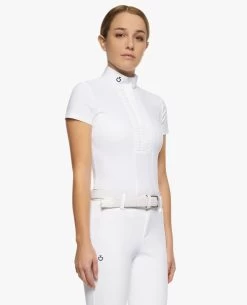 Cavalleria Toscana Short Sleeve Pleated Competition Shirt gives girls the comfort of technical fabric that is lightweight, stretchy, moisture wicking, and fast drying. It keeps odors in check so the shirt stays fresher on long show days. Girls Cavalleria Toscana equestrian show shirt has a slim fit, refined look, and silky feel that’s perfect for young riders who want to look and feel their best while competing.