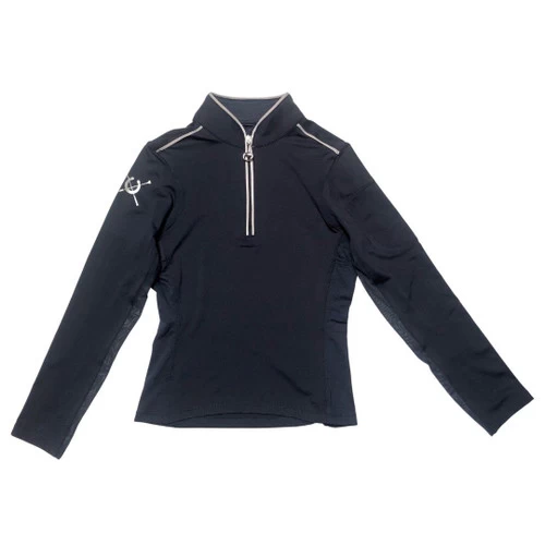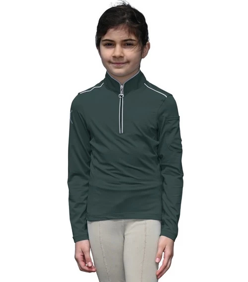 Chestnut Bay long sleeve quarter zip Performance Rider Youth SkyCool Shirt is breathable, odor resistant, moisture wicking, and fast drying. It has a longer back hem, tag-free neck label, and piping trim. Children’s casual riding shirt has four-way stretch for total mobility while riding or getting barn tasks accomplished. .The Performance Rider SkyCool Long Sleeve Shirt for kids offers excellent performance and style at an affordable price.