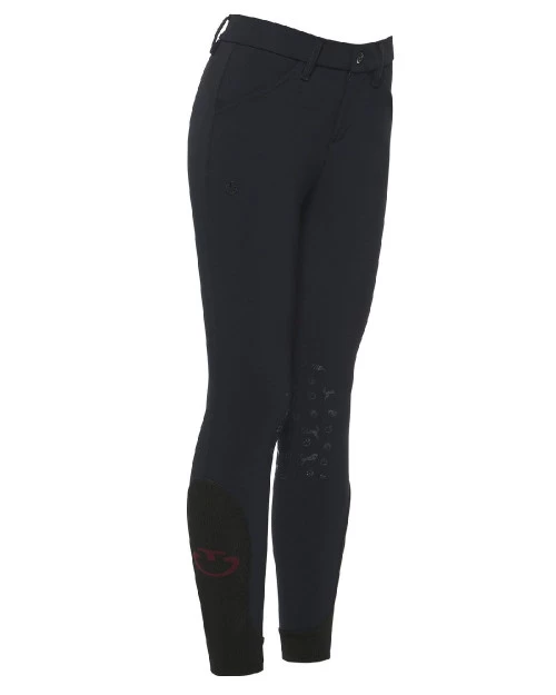 Boys and Girls hunter jumper breeches from Cavalleria Toscana offer a four-way stretch technical jersey fabric that is breathable and super comfortable. The exclusive Horse and Helmet silicone print knees provide flexible grip in the saddle. Front zip Euro seat breeches have front pockets and wide belt loops. Stretch knit panels at the lower leg accommodate different calf sizes and allow a sleek fit under tall boots and half chaps. Horse & Helmet Kids Breeches from Cavalleria Toscana are quality children’s equestrian clothes that work well for jumping, eventing, clinics, and lessons.