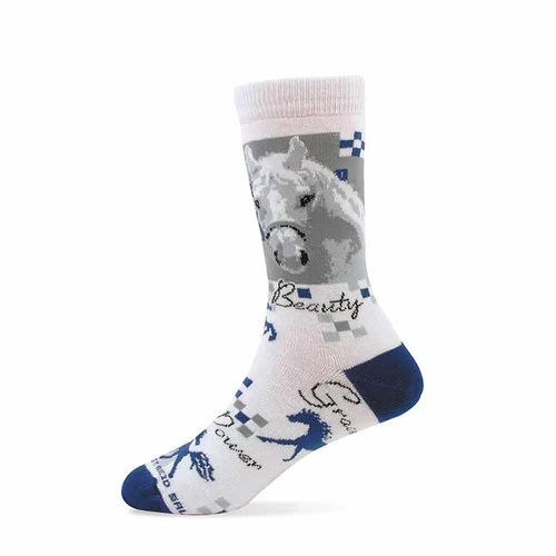 Kids Horse Prints Crew Socks are here in an assortment of fun horse themed patterns. Young riders can choose from horse head designs in Palomino or Grey as well as three other cute styles. Crew length paddock boot socks for children are lightweight, moisture wicking, and dry fast. They work well with paddock boots, cowboy boots, muck boots, rain boots, and sneakers.