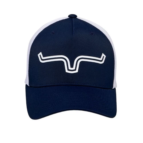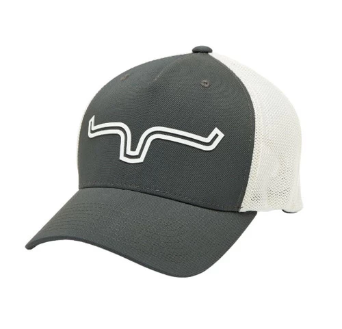 Kimes Ranch Double Trac 110 Cap features the iconic Kimes Ranch horns on the front in a white outline and FlexFit Tech for comfort. The horns are raised rubber/silicone with a clean, crisp look. The hat has a solid panel front with high quality mesh in back.