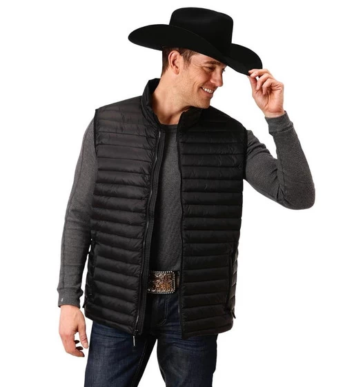You won’t believe how light and warm the Roper Men’s Quilted Down Vest is! This is the perfect Western style men’s outerwear for chilly days, where core warmth is key to comfort and performance. The Roper insulated vest is black, a versatile neutral that looks great with any shirts and jeans, and has elasticated armholes for mobility.