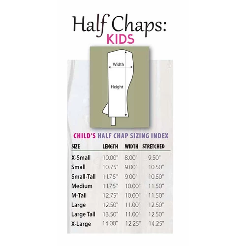 Kids Pro Half Chaps zip from the top down and snaps on both ends provide zipper security. The elastic arch band at the bottom helps prevent the chaps from shifting. Perri’s Professional Half Chaps for kids have a sleek, custom look for avid riders.