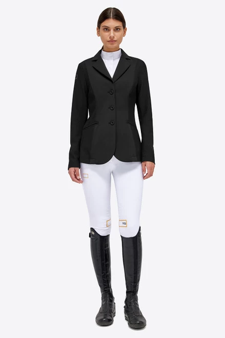 Women’s RG Jersey and Mesh Riding Jacket in versatile black was created with the goal of show ring comfort, classic style, and a contemporary edge. The Rider’s Gene RG Mesh Jacket is a traditional three button coat with with a smooth jersey front and technical mesh sides, sleeves, and back. The RG line is produced by Cavalleria Toscana.