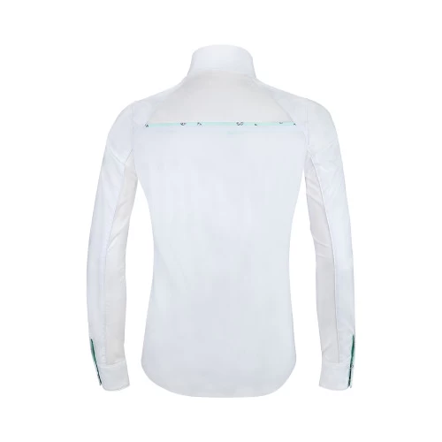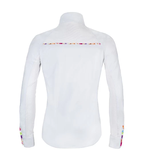 The Rebecca’s snap quarter placket style means easy pull-on and quick dressing for busy kids. The wrap collar closes with snaps and the covered placket assures a neat look under a hunt coat. Collar and cuffs of the Rebecca Junior Show Shirt are lined with an adorable new Popsicles pattern or older Unicorns or Cats pattern. Girls show shirt from RJ Classics features white mesh underarm panels and a mesh panel at the back shoulder area for extra ventilation. RJ Classics Rebecca Jr. Show Shirt adds signature style and a high level of performance to the competitive rider’s wardrobe.