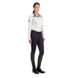 Romfh’s silky smooth Softtouch micro-PU fabric is a technical material that is stretchy, moisture wicking, and quick drying. The vertical stretch suede seat has a luxurious, light, comfortable feel and the darker colors won’t show saddle stains. Romfh ladies front zip dressage breeches have hand pockets in front that lay flat. The stretch material lower leg allows a close fit under your dress boots.